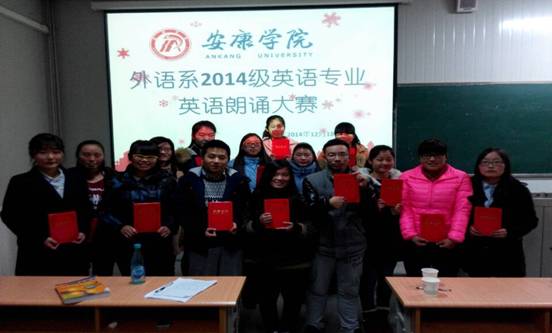 12月18日晚7点,由我系主办的2014级英语朗诵大赛决赛在1014教室成功举办。我系教师覃春晖、冯琳、胡青松及陈蕾担任评委,2014级英语专业全体学生参与。