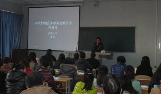12月19日上午,教育部高等学校外语专业教学指导委员会委员、教育部中小学英语学科“国培”项目首席专家、西南大学外国语学院院长、博士生导师李力教授应邀来我系讲学,为我系师生作了题为“对农村地区小学英语教学的再思考”的学术报告。我系教师教育教学团队教师、“国培计划(2014)”陕西省小学英语学科培训班学员以及我系2013级、2012级英语师范生参加了报告会。