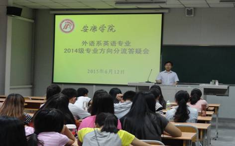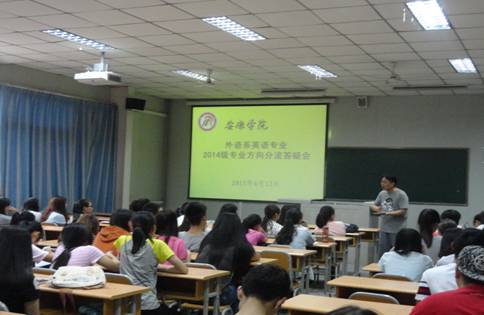最后,张哲华副主任结合外语系的专业建设和人才培养强调,师范和翻译就业方向不一样,但地位同等重要。无论选择师范或是翻译,在低年级阶段都要夯实专业基础和扎实专业技能,为以后的职业技能学习打下坚实基础。同时,他对英语专业14级全体学生提出了殷切希望,希望他们在做出方向选择后能够坚持选择,勤奋进取,刻苦学习,为增加自己的专业度和提升自己的就业竞争力而努力。
