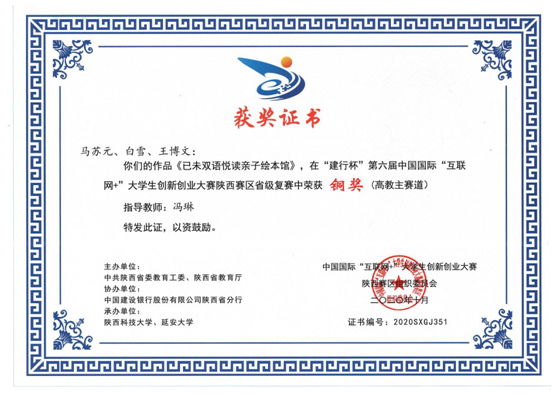 我院参赛作品《已未双语悦读亲子绘本馆》获得高教主赛道铜奖。《已未双语悦读亲子绘本馆》由我院冯琳老师指导,马苏元、白雪、王博文等3名同学组成的团队完成,该作品通过分析研究安康地区0-8岁儿童阅读的现状与问题,创办可提供“专业亲子绘本阅读指导”的社区型亲子绘本馆,旨在辅助家庭建立良好的亲子阅读习惯、提供综合阅读一站式解决方案,致力于在经济落后地区推广早期亲子阅读教育。