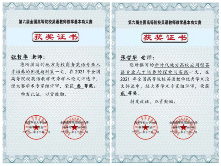 近日,2021年全国高等院校英语教学优秀学术论文评选结果揭晓,我院院长张哲华撰写提交的论文《新时代地方高校应用型英语专业人才培养的探索与实践》荣获二等奖,《地方高校商务英语专业人才培养的困境与对策》荣获三等奖。