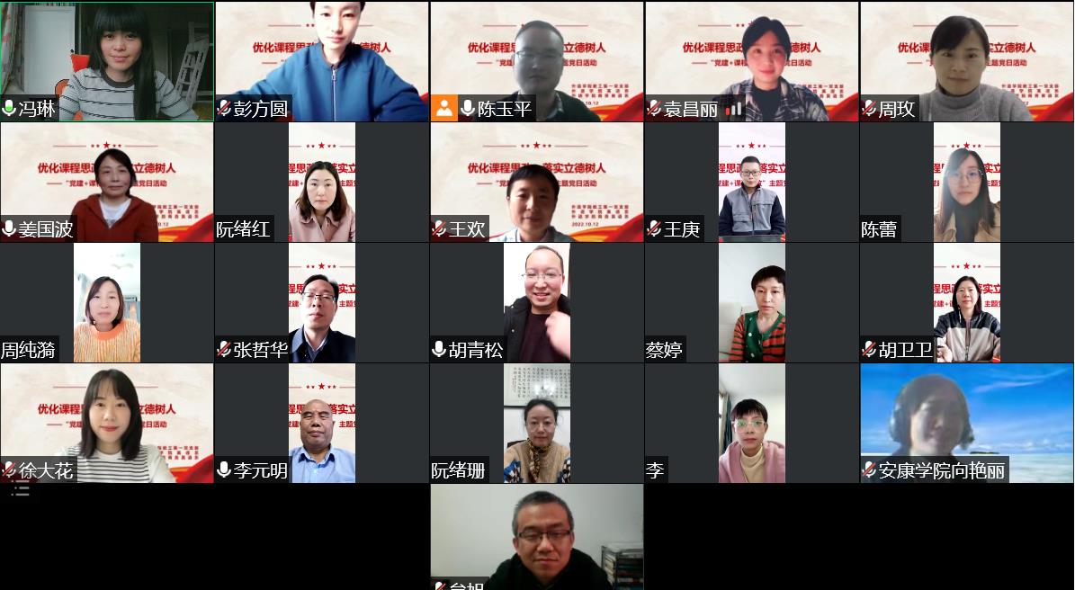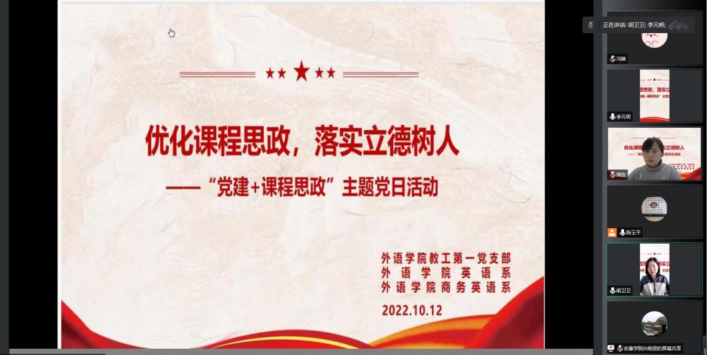 为进一步提升党建示范引领作用,强化党建与业务的深度融合,加强党支部思想政治工作的针对性和亲和力,强化立德树人的主渠道,提高线上教学中课程思政的针对性和实效性,促进中外知识共同体之间的主体性竞争与生成性话语实践,革新新时代外语教育的精神体系和文化价值观,以新的面貌、更加优异的成绩迎接党的二十大。10月12日下午,新葡萄8883官网AMG教工第一支部以线上沙龙的形式开展了“优化课程思政,落实立德树人”主题党日活动。新葡萄8883官网AMG教工一支部全体党员,英语系、商务英语系全体教师参加,活动由新葡萄8883官网AMG教工一支部书记陈玉平主持。
